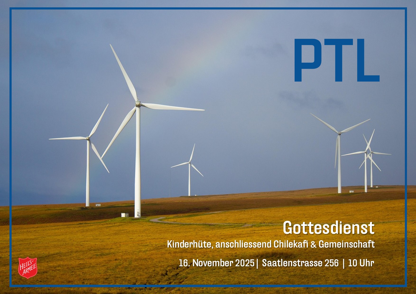 Herzliche Einladung zum PTL-Gottesdienst am nächsten Sonntag, 16. November um 10.00 Uhr. Gemeinsam loben wir unseren Gott, beten, hören auf sein Wort und entdecken gemeinsam, was sich hinter der Überschrift der Einladung, PTL, verbirgt. Anschliessend darf man gerne noch beim Chilekafi verweilen. Für die Kinder wird eine Kinderhüte angeboten.